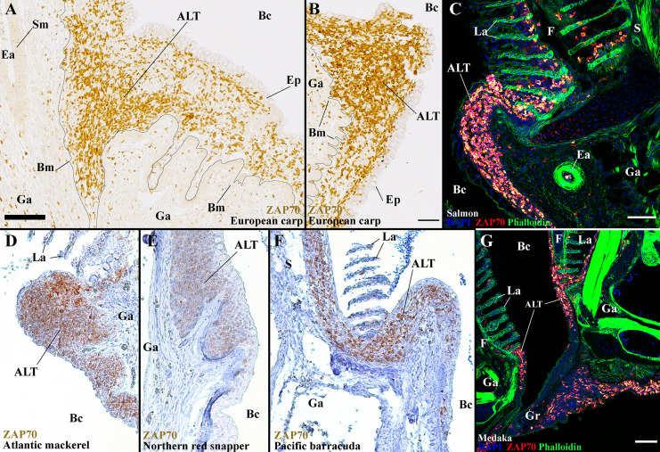 The ALT is a preserved structure between distant teleost species. Representative acquisitions of anti-ZAP70 (brown/red hot) labeled gills section, from different fish species, displaying the side of a gill arch, at the base of filaments.