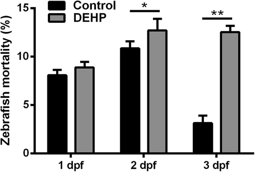 Fig. 1 DEHP-induced mortality in zebrafish larva. At 1 dpf, no significant difference was found in embryonic lethality between control and DEHP groups. At 2 and 3 dpf, zebrafish mortality was significantly increased in the DEHP group. *p < 0.05 and **p < 0.01. DEHP: di-2-ethylhexyl phthalate; dpf: day postfertilization.