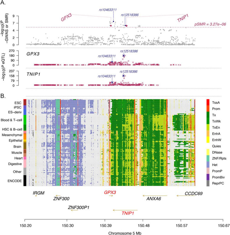 Summary statistics-based Mendelian Randomisation (SMR) analysis identifies GPX3 and TNIP1. Regional map association plot of GPX3 and TNIP1 from summary statistics-based SMR analysis. The x-axis, chromosome position, is the same in all plots. A Grey dots represent the GWAS p-values, with the purple diamonds representing the SMR test p-values for the two genes (GPX3 and TNIP1) probes that pass the SMR genome-wide significance threshold (dashed line). The purple crosses are the association p-values between the SNP and gene probe. The SNP most highly associated with both GPX3 and TNIP1 expression is rs12518386 (GWAS association pGWAS = 8.33 × 10−7, Beffect GWAS = 0.08, peQTL:GPX3 = 1.05 × 10−171, peQTL:TNIP1 = 2.04 × 10−163). The SNP most associated with ALS is rs10463311 (pGWAS = 4.00 × 10−8, Beffect GWAS = 0.09, peQTL:GPX3 = 4.85 × 10−18, peQTL:TNIP1 = 1.80 × 10−36) (Additional file 1: Table S12). B The locus is in a region of open chromatin (each row is a cell type, 13 tissue/cell categories in total on the left) including transcriptional areas and enhancers (coloured legend on the right) between GPX3 (transcribed on the forward strand) and TNIP1 (transcribed on the reverse strand)
