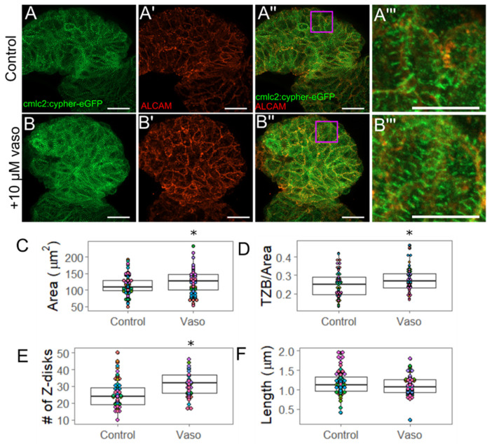 Figure 3 Increased pressure causes hypertrophy of ventricular outer curvature (OC) myocytes by 56 hpf. (A) Control and (B) vaso-treated hearts showing z-disks (A,B) and cell shape through ALCAM immunohistochemistry (A′,B′). (A′′,B′′) display merged images. Purple box shows regions of interest shown in (A′′′,B′′′). For A–A′′, and B–B′′, scale bar represents 20 µm. (A′′′) Control and (B′′′) vaso-treated hearts. Scale bar represents 10 µm. (C) Area of ventricular OC cells in control and vaso-treated hearts. (D) Total z-disk size (TZB) of sarcomeres present in each cell normalized to the area of each cell (1/µm). For details for how TML was measured, see supplemental Figure S11. (E) Number of z-disks per cell in control and vaso-treated hearts. (F) Average length of the sarcomeres present in each cell. For control and vaso-treated hearts, 14 fish were analyzed. Five cells from the OC were analyzed per fish, such that 70 total cells were analyzed. Each colored dot on the graph above represents an individual fish. * indicates p < 0.05, Student’s t-test was used for statistical comparisons