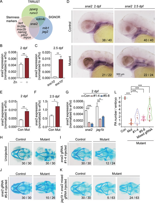 Snai2 is the upstream regulator of jag1b. (A) Venn diagram summarizing the overlap among genes determined by cross‐referencing the Transcriptional Regulatory Relationships Unraveled by Sentence‐based Text‐mining (TRRUST) database, SIGnaling Network Open Resource (SIGNOR) database, and stemness markers analyzed using SMART‐seq. (B) Summary of snai2 mRNA measured in sox10 + cells isolated from control embryos and control embryos exposed to 1 mM zinc. (C) Summary of snai2 mRNA measured in sox10 ‒ and sox10 + cells isolated from Tg(sox10:kikGR) embryos. (D) in situ hybridization of snai2 in control and mutant embryos at 2 and 2.5 dpf. (E and F) Summary of snai2 mRNA measured in sox10 + cells isolated from control and mutant embryos at 2 dpf (E) and 2.5 dpf (F). (G) Summary of snai2 mRNA and jag1b mRNA measured in wild‐type embryos and wild‐type embryos injected with two different sets of snai2 CRISPR/Cas9 ribonucleoprotein complexes. (H–K) Representative images of cartilage staining of control and mutant embryos. Where indicated, the embryos were injected with the snai2 CRISPR/Cas9 ribonucleoprotein complexes (I and J) or both the snai2 and jag1b CRISPR/Cas9 ribonucleoprotein complexes (K). Examples of two distinct mutant phenotypes, with the corresponding frequencies, are shown in panel (K). (L) Violin plot summarizing the number of PA pairs/embryos in control embryos and mutant embryos injected with the snai2 CRISPR/Cas9 ribonucleoprotein complexes alone or together with the jag1b CRISPR/Cas9 ribonucleoprotein complexes (mixed gRNA). *p < 0.05, **p < 0.01, and ***p < 0.001