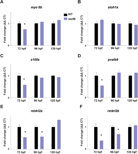Fig. 5 The otofB mutation results in altered expression of hair cell–related transcripts. (A–F) Quantification of mRNA by qRT-PCR for myo6b, atoh1a, s100s, pvalb9, ret4rl2a, ret4rl2b in wild-type and otofB larvae at 72, 96, and 120 hpf. (A) Quantification of myo6b mRNA, (B) quantification of Atoh1a mRNA, (C) quantification of s100s mRNA, (D) quantification of pvalb9 mRNA, (E) quantification of rtn4rl2a mRNA, (F) quantification of rtn4rl2b mRNA in wild-type and otofB larvae at 72, 96, and 120 hpf (t test, p < 0.001). N = 4 for both WT and mutant, with each N as a composite of 20–30 larvae. The data presented are representative of three experimental replicates for each time point. Error bars are SEM.