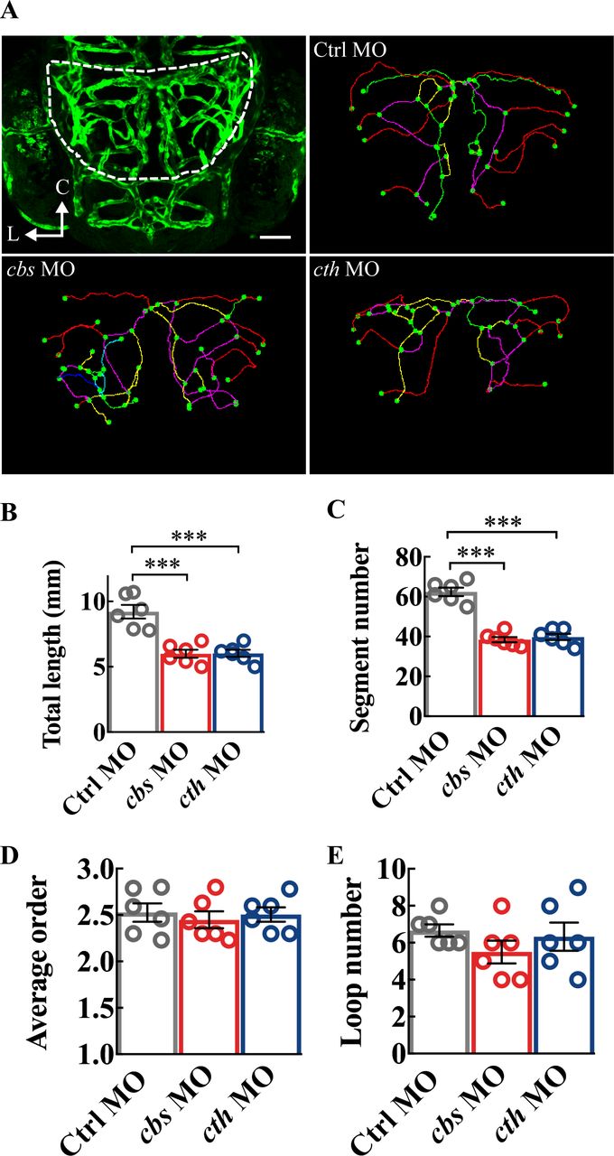 Fig. 3 Structure analysis of the midbrain vasculature in cbs and cth morphants. (A) Image of a 3-dpf larva showing the midbrain position delineated with dashed lines (upper left), and representative midbrain vasculature centerlines of 3-dpf larvae of Ctrl morpholino oligonucleotide (MO; upper right), cbs MO (lower left), and cth MO (lower right). C, caudal; L, lateral. (B–E) Summary of changes in the total vessel length (B), vessel segment number (C), weighted average segment Strahler order (D) and internal vessel loop number (E) of the midbrain vasculature in groups of Ctrl MO, cbs MO and cth MO. Six embryos were examined for each group. Error bars, SEM. ***P<0.001 (unpaired two-tailed Student’s t-test).