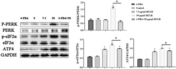 Fig. 6 The bands of PERK, p-PERK, eIF2α, p-IF2α, ATF4 and GAPDH expression levels measured by using Western blotting assay in TM4 cells (n = 3). * P < 0.05 significantly different from control group. ▲P < 0.05 significantly different from 30 μg/mL MCLR.