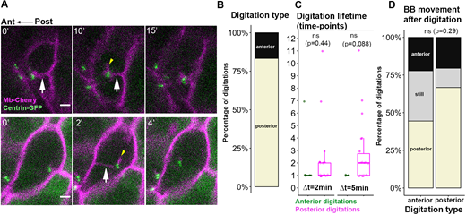 Fig. 3 Membrane digitations link BBs to ant/post membranes during FP polarization. (A) Images from live imaging (Δt=2 or 5 min) showing posterior (top) and anterior (bottom) digitations (white arrows). Time (in min) is indicated in the upper-left corner. Short mCherry-positive digitations, presumably cilia, were associated with the BB in some cases (yellow arrowheads). (B) Percentage of posterior and anterior digitations from live-imaging analyses (54 digitations, eight embryos, 22 cells). (C) Number of time-points at which anterior or posterior digitations were detected in movies with Δt=2 or 5 min (Δt2 min: 6 anterior, 23 posterior digitations, four embryos, eight cells. Δt5 min: three anterior and 22 posterior digitations, six embryos, 13 cells). ns, P>0.05 (Wilcoxon rank sum test). Digitations were most often observed in a single or two consecutive timeframes. Box boundaries represent the first and third quartiles of the distribution, and boxplot whiskers span 1.5 times the interquartile range of the distribution. (D) BB movements after anterior or posterior digitation (48 digitations, eight embryos, 22 cells). ns, P>0.05 (Fisher's exact test). Scale bars: 2 µm.