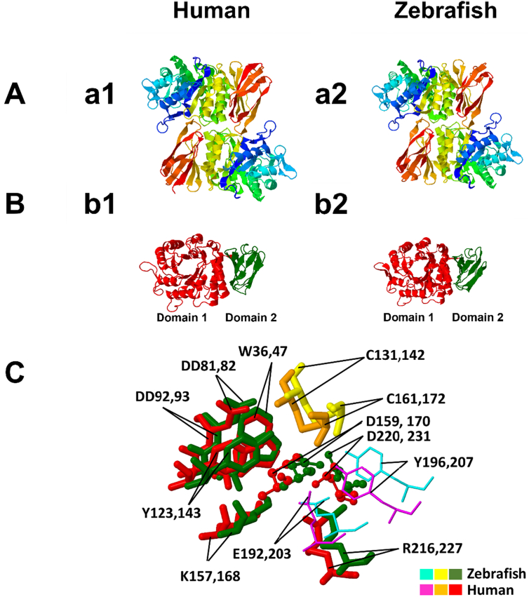 Structure prediction of the zebrafish α-GAL. (a1) homodimer structure of human α-GAL; (a2) homodimer structure of zebrafish α-GAL. The dimers are colored from N-terminal (blue) to C-terminal (red). The structure prediction shows that the zebrafish α-GAL folds in a pattern highly similar to its human counterpart. (b1) is the monomer of a human α-GAL enzyme showing the two domains, while (b2) is the zebrafish α-GAL enzyme showing the same structure. Domain 1, (β/α)8 barrel, extends through residues 32–330 in human (red) and 21–319 in zebrafish (red), and contains the active site, while domain 2 extends through residues 331–429 in human (green) and 320–409 in zebrafish (green) and contains antiparallel β strands. C: the superimposed structure of the two enzymes active sites and substrate binding site, with substrate specificity residues W36, D81, D82, Y123, K157, R216 in zebrafish and W47, D92, D93, Y143, K168, R227 in human, are fully conserved between the two species. The active sites D159 and D220 in zebrafish, D170, and D231 in humans are also conserved. The residues C131 and C161 zebrafish and C142 and C172 human help to stabilize the conformation of the substrate-binding site through the formation of disulfide bonds. The substrate-binding site boundaries E192 and Y196 in zebrafish correspond to E203 and Y207 in humans. Color ligands for zebrafish and human are shown in plate C. (For interpretation of the references to color in this figure legend, the reader is referred to the web version of this article.)