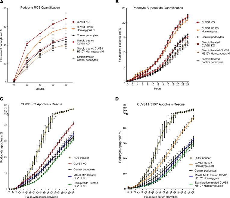 (A and B) Automated live-cell imaging and quantification of ROS levels in CLVS1-KO podocytes as well as controls using a fluorescent reporter of multiple ROS types, including hydrogen peroxide, peroxynitrite, and hydroxl radicals (A) (n > 20 for each group, P < 0.0001 for all time points for KO, P < 0.05 for all time points, and after 20 minutes for KI, 2-way ANOVA), as well as a second independent fluorescent reporter that detects superoxide generation (B) (n > 20 for each group, P < 0.001 for all time points after 10 hours, 2-way ANOVA), revealed an increase in ROS and superoxide accumulation in CLVS1-KO and homozygous KI podocytes that could be rescued with pretreatment with 1 μM dexamethasone. (C and D) The increased susceptibility to apoptosis in CLVS1-KO and homozygous KI podocytes (P < 0.05 for all time points after 36 hours) could be rescued by treatment with a superoxide scavenger or an ROS inhibitor (5 nM MitoTEMPO and 500 nM elamipretide) (n > 10 for all conditions, 2-way ANOVA). The ROS inducer pyocyanin (300 μM) and ROS inhibitor N-acetyl-l-cysteine (5 mM) were used as positive and negative controls, respectively, for all experiments. Error bars depict SEM.