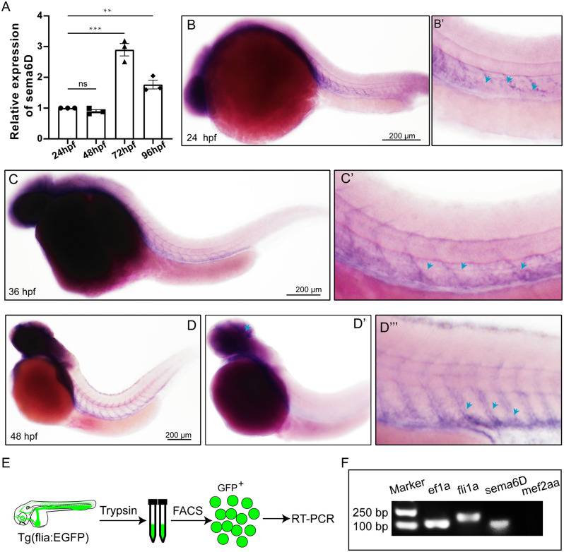 Figure 2. Expression of sema6D gene in embryonic zebrafish at different stages. (A) QRT-PCR analysis of sema6D expression in embryonic zebrafish at different stages (n = 3). One-way ANOVA, values with ** and *** above the bars are significantly different (P < 0.01 and P < 0.001, respectively); value with “ns” above the bars indicated no significantly different. (B–D) Whole mount in situ hybridization analysis of sema6D in zebrafish embryos at different stages, blue arrowheads indicate blood vessels. (E) The procedure of the endothelial cells sorting and RT-PCR. (F) The agarose gel electrophoresis results of RT-PCR on fli1a-EGFP sorted cells.