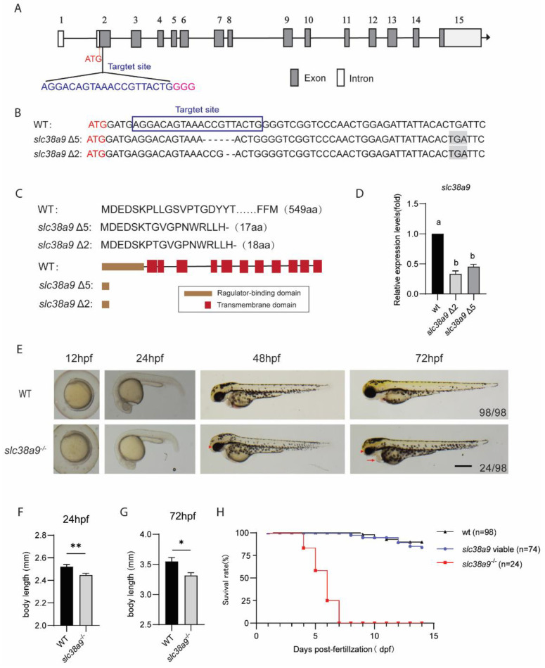 Figure 2. Knockout slc38a9 cause developmental defects in zebrafish. (A) Zebrafish slc38a9 gene structure. The selected Cas9 target sites sequence (blue) is in the second exon of the zebrafish slc38a9 gene. The PAM sequence is colored in pink. (B) The sequencing trace data of wild type and slc38a9 mutant alleles. The black shade is a premature stop codon. (C) The upper panel is the SLC38a9 protein sequences of WT and mutants. The lower panel is the schematic of the predicted SLC38A9 protein domains of WT and mutants. (D) Relative expression levels of slc38a9 mRNA in mutant and WT zebrafish at 3 dpf. The mRNA levels of slc38a9 were measured by qRT-PCR and normalized by β-actin mRNA levels. Data shown are mean ± SEM, n = 3. Different letters indicate significant differences at p < 0.05. (E) Live images of WT and mutant at the indicated developmental stage. The Arrowhead indicates the smaller eyes of the mutant, and arrow indicates the edematous pericardial cavity of the mutant. Scale bar = 500 μm. (F, G) The body length of mutant zebrafish was shorter than WT at 24 and 72 hpf. Data shown are mean ± SEM, n = 10. * p < 0.05, ** p < 0.01. (H) Viability of wild type and slc38a9 mutant larvae.