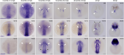 Endocardial markers are first expressed at 8 s in zebrafish embryos.In situ hybridisation for endocard:egfp, nfatc1 and cbfa2t3 expression in embryos from 5 s (11.5 hpf) through to 48 hpf, showing expression emerging in the endocardium from 8 s onwards. White arrowheads show the expression domains corresponding to endocardial cells and their progenitors. nfatc1 expression is also observed in the olfactory placode (black arrows) as previously described. cbfa2t3 expression is also seen in otic vesicle progenitors (black arrowheads) and throughout the neural system (black arrows). Anterior to the top in all images. Anterior views at 48 hpf, all other images show dorsal views. Scale bars: 100 μm. The number of embryos matching the image shown is indicated in the top right of each image.