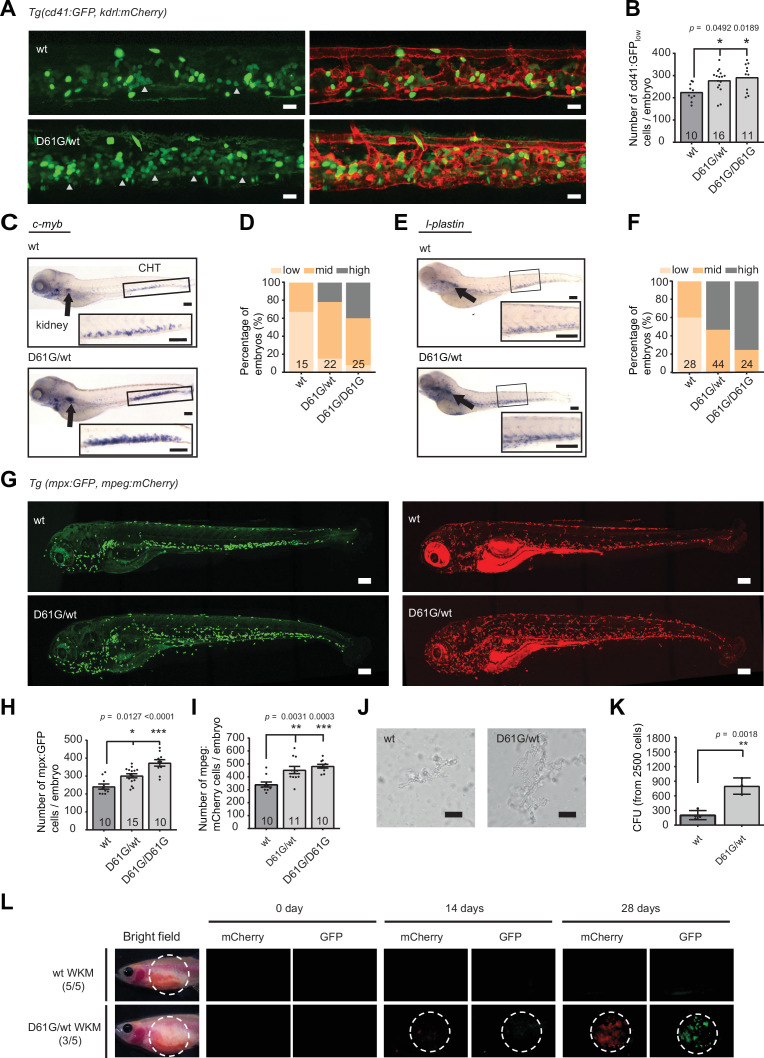 (A) Representative images of the caudal hematopoietic tissue (CHT) region of Shp2wt and Shp2D61G zebrafish embryos in Tg(cd41:GFP, kdrl:mCherry-CAAX) background at 5 days post fertilization (dpf). cd41:GFPlow cells mark hematopoietic stem and progenitor cells (HSPCs) and cd41:GFPhigh cells thrombocytes. Gray arrow heads indicate cd41:GFPlow cells. Scale bar, 20 μm. (B) The low-intensity cd41:GFP-positive cells in the CHT region were counted. (C) Whole-mount in situ hybridization (WISH) of 5 dpf Shp2wt and Shp2D61G/wt embryos using c-myb-specific probe. Head kidney (arrow) and CHT (box) are indicated; zoom-in in inset. Scale bars, 150 μm. (D) Quantification of c-myb WISH. C-myb expression in Shp2wt, Shp2D61G/wt, and Shp2D61G/D61G embryos was scored as low, mid, and high. (E) WISH of 5 dpf Shp2wt and Shp2D61G/wt embryos using l-plastin-specific probe. Head kidney (arrow) and CHT (box) are indicated and zoom-in in inset. Scale bars, 150 μm. (F) Quantification of l-plastin expression in Shp2wt, Shp2D61G/wt, and Shp2D61G/D61G embryos scored as low, mid, and high. (G) Representative images of Shp2wt and Shp2D61G zebrafish embryos in Tg(mpx:GFP, mpeg:mCherry) background at 5 dpf. Mpx:GFP marks neutrophils and mpeg:mCherry macrophages. Scale bars, 150 μm. (H,I) Number of mpx:GFP and mpeg:mCherry-positive cells per embryo. (J) Representative images of colonies developed from cd41:GFPlow cells isolated from the CHT of 5 dpf Shp2wt and Shp2D61G/wt zebrafish embryos, grown in methylcellulose with zebrafish cytokine granulocyte colony stimulating factor a (Gcsfa) for 2 days. Scale bar, 50 μm. (K) Quantification of number of colonies from J, t-test. (L) WKM cells harvested from Shp2wt and Shp2D61G zebrafish in the Tg(mpx:GFP, mpeg:mCherry) background were injected into the peritoneum of adult prkdc-/- zebrafish. Recipients were monitored by fluorescence imaging. (B,D,F,H,I,K) Measurements originate from at least three distinct experiments. Number on bars: number of embryos. (B,H,I,K) Error bars represent SEM. *p < 0.05, **p < 0.01, ***p < 0.001. (B,H,I) ANOVA complemented by Tukey’s HSD.