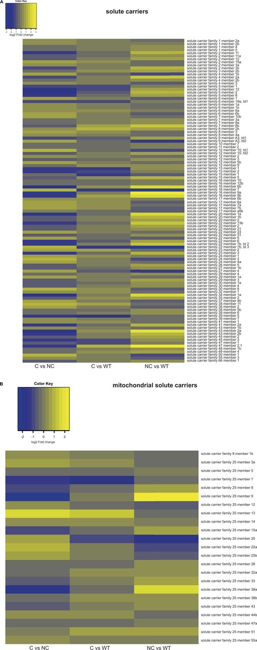 (A) Heat map of expression in C versus NC, NC versus WT, and C versus WT, of solute carriers in plasma membrane. “td” = tandem duplicate. Family 1 = amino acid transporters; Family 2 = glucose transporters; Family 3 = heteromeric amino acid transporters; Family 4 = bicarbonate transporters; Family 5 = Na+-dependent glucose transporters; Family 6 = neurotransmitters transporters; Family 7 = heteromeric aa transporters; Family 8 = sodium/calcium transporters; Family 9 = sodium/hydrogen transporters; Family 10 = sodium bile acid transporters; Family 11 = proton coupled chloride transporters; Family 12 = cation coupled chloride transporters; Family 13 = sodium-dependent dicarboxylate transporter; Family 15 = proton oligopeptide transporters; Family 16 = monocarboxylate transporter; Family 17 = phosphate and organic transporters; Family 20 = sodium-dependent phosphate transporters; Family 22 = organic and anion transporters; Family 23 = ascorbic acid transporters; Family 24 = sodium/potassium/calcium transporters; Family 26 = anion exchangers; Family 27 = fatty acid transporters; Family 29 = nucleoside transporters; Family 30 = zinc transporters; Family 32 = GABA of glycine vesicle transporters; Family 34 = sodium phosphate; Family 35 = nucleotide sugar; Family 37 = phosphosugar/phosphate exchangers; Family 38 = sodium-dependent neutral amino acid; Family 39 = metal ion transporters; Family 41 = divalent cation transporters; Family 43 = large neutral amino acid transporters; Family 45 = putative sugar transporters; Family 47 = multidrug and toxin extrusion transporters; Family 48 = heme transporter; Family 49 = FLVCR-related heme transporters; Family 50 = sugar transporters; Family 66 = lysosomal amino acid transporters. (B) Heat map of expression in C versus NC, NC versus WT and C versus WT, of mitochondrial solute carriers (SLC family 25). “Solute carrier family 8 member 1b” = Na+/Ca2+ exchanger; “Solute carrier family 25 member 13” = aspartate-glutamate carrier; “Solute carrier family 25 member 15a” = ornithine transporter role in urea cycle; “Solute carrier family 25 member 22a” = malate-aspartate shuttle, glutamate transporter; “Solute carrier family 25 member 38a” = mitochondrial glycine transporter functions in heme biosynthesis, orthologue of APOPTOSIN.” Solute carrier family 25 member 55a” = letmd1.