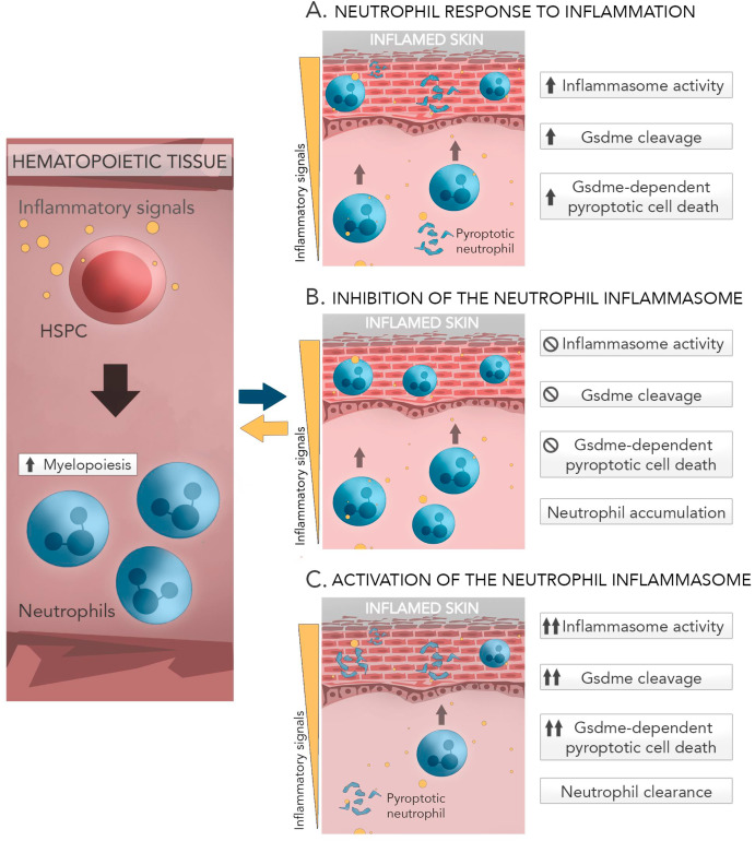 Fig. 6 Fig. 6. Proposed working models showing the induction of Gsdme-mediated pyroptotic cell death in macrophages and neutrophils during chronic inflammation. During chronic inflammation, inflammatory signals from the inflamed tissue reach hematopoietic tissue and promote the differentiation of HSPCs to macrophages and neutrophils (emergency myelopoiesis). A) Neutrophils are recruited by a gradient of inflammatory signals to the inflamed tissue and once there they develop their function and die by pyroptosis allowing the regulation of the number of neutrophils needed to resolve the inflammation. B) Inhibition of the neutrophil inflammasome by forced expression of DN-Asc impaired pyroptosis and leads to accumulation of neutrophils in the inflamed tissue. C) Activation of the neutrophil inflammasome by forced expression of Gbp4 further promotes pyroptosis of neutrophils infiltrated in the inflamed skin, resulting in neutrophil clearance. A similar mechanism operates in macrophages (not shown).