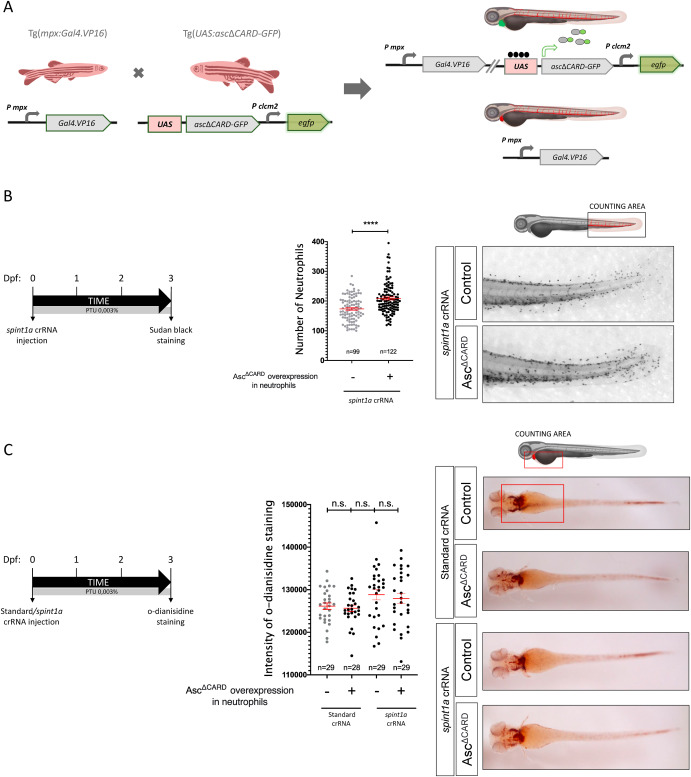 Fig. 2. Inhibition of the neutrophil inflammasome leads to an increase in the number of neutrophils in zebrafish with skin inflammation. (A) Schematic showing the zebrafish lines used to inhibit neutrophil inflammasome. The offspring were screened using fluorescent green heart marker of the Tg(uas:ascĪCARD-GFP). (B, C) One-cell stage zebrafish eggs were microinjected with control or spint1a crRNA/Cas9 complexes. At 3 dpf, neutrophils (B) and erythrocytes (C) were stained with neutral red, Sudan black and o-dianisidine, respectively. ****p < 0.0001; n.s., non-significant.