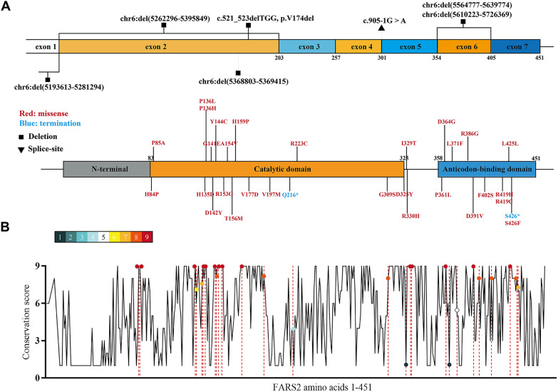 Distribution and conservation analysis of FARS2 pathogenic mutations. A Distribution of 30 missense mutations, 2 nonsense mutations, 6 inframe or outframe deletions and 1 splice-site mutation on human mtPheRS. B A graphical illustration of mtPheRS sequence conservation (black line) based on the ConSurf conservation score. Mutation sites (dots) are indicated