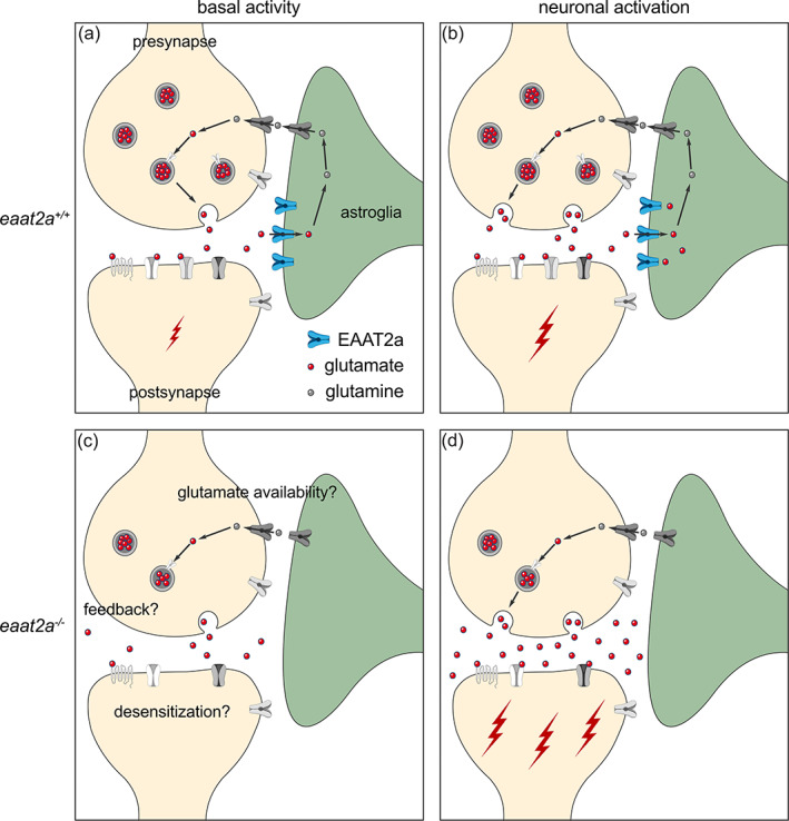 Working model of coexisting hyper‐ and hypoactivity in eaat2a −/− mutants. (a, b) Glutamate transporter EAAT2a is important for both clearance of glutamate at the synaptic cleft and recycling of glutamate to the presynapse during basal activity (a) and neuronal activation (b). (c) Loss of EAAT2a function leads to neuronal hypoactivity during basal periods, potentially reflecting reduced levels of available glutamate/glutamine. (d) Once glutamate is released in higher quantities from the presynapse (e.g., following light stimuli or spontaneous glutamate release), astroglia cannot sufficiently take up glutamate. Accumulated glutamate in the synaptic cleft hyperexcites postsynaptic neurons, which can lead to a cascade of glutamate release across the nervous system and results in epileptic seizures. Such recurrent epileptic seizures could also potentially lead to desensitization or a negative feedback to the presynapse (c), which can further explain reduced basal neuronal activity in eaat2a −/− mutants