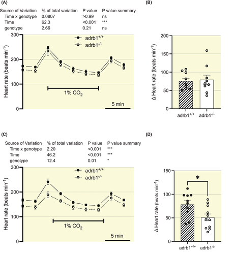 The effect of sustained hypercapnia (10 min) on heart rate in 5 (A, B) and 6 (C, D) dpf adrb1+/+ and adrb1−/− zebrafish larvae. Statistical results are the output of a repeated-measures two-way ANOVA (A, C). In panels B and D, the maximum changes in heart rate were calculated for each individual immediately after the onset of hypercapnia; genotypes were compared using unpaired t-test. ns, p > 0.05; *p < 0.05; **p < 0.01, ***p < 0.001. N = 9–11. Data points show means ± SEM (A, C), bars show means ± SEM and individual points (B, D).