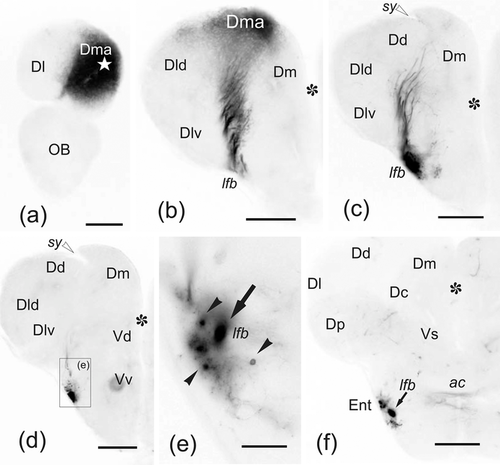 (a–f) Photomicrographs of transverse sections through the telencephalic lobes of zebrafish, from rostral to caudal, showing labeled cell bodies (black arrowheads) and fibers (arrows) after application of DiI to the rostralmost medial zone of the pallium (Dma). (a) Labeling of Dma around the accessed region (white star). (b–c) Sections of more caudal regions showing scant Dma connections with adjacent pallial regions (b), and small fiber bundles coursing toward the (lfb) through deeper pallial regions. (d–f) A terminal field labeled in the entopeduncular nucleus. In (e), note afferent neurons to Dma (arrowheads). Asterisk: telencephalic ventricle. Midline is to the right. Ipsilateral side is to the left. (e) is a detail of the squared area in (d). For abbreviations, see the list. All photomicrographs are negative images of fluorescent data. White arrowheads: sulcus ypsiloniformis. Scale bars: 200 μm (a–d, f); 50 μm (e)