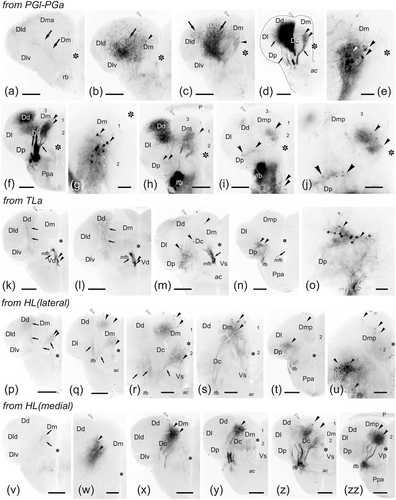 (a–zz) Photomicrographs of transverse sections through the telencephalic lobes showing labeled cells (black arrowheads) and fibers (arrows) after application of DiI to the extratelencephalic areas indicated at top left of each picture group. (a–j,) Labeling from the lateral preglomerular nucleus, (k–o) from the torus lateralis, and (p–u) from the lateral part of the hypothalamic lobes; (v–zz) from the medial part of the hypothalamic lobes. Ipsilateral is to the left. Numbers 1–3 indicate the Dm subdivisions. Open arrowheads point to the sulcus ypsiloniformis. Asterisk, midline ventricle. For abbreviations, see the list. All photomicrographs are negative images of fluorescent data. Scale bars: 200 μm (a–d, f, h–i, k–n, p–q, t, v, x–zz); 100 μm (j, r–s, u, w); 50 μm (e, g, o)