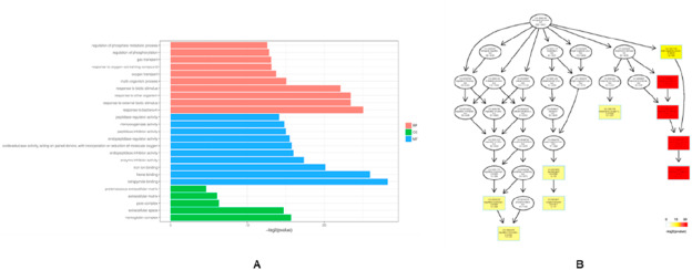 Fig. 3 Fig. 3. GO bar chart with significant accumulation and dendrogram of BP terms. (A) GO bar chart with significant accumulation: Significantly enriched GO terms based on p ≤ 0.05, horizontal axis means logarithm of p value, vertical axis means the GO items, BP terms are shown in red, MF terms are shown in blue, CC terms are shown in green. (B) Dendrogram of BP terms: Each node represents a GO term, and the box represents the GO term of the top 10 in the order of the degree of significant accumulation. The depth of the color represents the degree of enrichment, and the darker the color, the higher the degree of enrichment. Each node displays GO ID and GO description. . (For interpretation of the references to color in this figure legend, the reader is referred to the Web version of this article.)