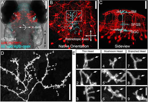 Dendritic spines on PyrN apical dendrites. (A) Dorsal view, whole-brain confocal image volume of an 8 dpf double transgenic Tg(id2b:gal4,uas-e1b:ntr-mCherry) larva injected at the embryo stage with uas:egfp-caax plasmid to generate sparse labeling. Note the single EGFP-labeled PyrN in each tectal lobe. (B) Higher magnification of the maximum projection of neurons labeled in the right tectal lobe of the larva in A. Projection is shown from the dorsal view, with 0° rotation. Note that this view was used for subsequent measurements of dendrite area along the retinotopic axes. (C) Maximum projection of same neuron rotated −50° about the x-axis, to yield an orientation parallel to the tectal layers. Note the clearly stratified neurite morphology with arbors in the SM, SFGS and SGC layers of the tectal neuropil. (D) High magnification view of a subvolume of the SM-targeted dendrite of PyrN in B,C as indicated by the box in B. Note the branched arbor decorated with multiple short protrusions. Numbered arrows indicate spines selected for higher magnification views. (E) 3× magnified views of nine dendritic spines indicated by arrows in D. Note the presence of different types of spine heads: thin, mushroom and branched. Images are representative of 20 PyrNs. Scale bars: 100 µm (A); 25 µm (B,C); 10 µm (D); 1.65 µm (E).