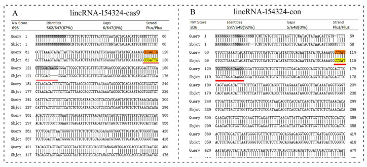 The sequence detection results for lincRNA-154324 knockout. (A) Alignment of caudal fin sequences from the control and the lincRNA-154324-cas9-knockout F0-generation adult zebrafish. (B) Alignment of caudal fin sequences from the control and the lincRNA-154324-con F0-generation adult zebrafish. Highlight, red line and red box: indicates the knockout target site area.