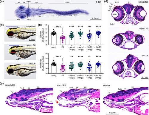 wars1 messenger RNA (mRNA) is predominantly expressed in the zebrafish eye, brain, and muscle in the embryo and wars1 F0 mutants display gross morphological defects. (a) The wars1 mRNA expression in the 1 dpf embryo. Dorsal view, anterior to the left. (b) wars1 knockouts are generated by CRISPR/Cas9. Uninjected control, wars1 F0 mutant and wars1 F0 mutant rescued with wild-type WARS1 mRNA (rescue) embryo at 3 dpf. Blue line indicates the brain size. Red line indicates the eye size. Black arrow indicates heart edema. Lateral view, anterior to the left. (c) Quantification of eye and head size from uninjected controls, wars1 F0, wars1 F0 + 150 or 200 picogram (pg) of zebrafish wild-type wars1 mRNA (+wars1), and wars1 F0 + 150 or 200 pg of human wild-type WARS1 mRNA (+WARS1). Each group contains 30 embryos, and each dot represents one embryo. Error bar = mean ± SD. One-way analysis of variance (ANOVA) with Tukey's multiple comparisons test: ns, not significant p ≥ 0.05, **p < 0.01, ***p < 0.001, and ****p < 0.0001. All marked groups were compared to wars1 F0 mutant embryos. (d, e) Histological analysis of uninjected control, wars1 F0 mutant, and wars1 F0 mutant rescued with human wild-type WARS1 mRNA (rescue) larva at 5 dpf by cross-section (d) and sagittal section (e). Red asterisk indicates loss of cell density. Red arrow indicates the shorter lower jaw. Forebrain (fb), midbrain (mb), midbrain and hindbrain boundary (MHB), hindbrain (hb), optic tectum (TeO), otic vesicle (ov), retinal pigment epithelium (RPE), outer nuclear layer (ONL), inner nuclear layer (INL), inner plexiform layer (IPL), ganglion cell layer (GCL), tectum (tc), telencephalon (Tel), and cerebellum (ce).
