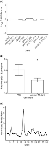 ap3d1 gene expression is reduced overall in crasher mutants, but exon 14 of ap3d1 is overexpressed. (a) RNA-Seq data bar graph shows no reduction in any candidate gene in crasher mutants as compared to *AB to a log2 fold difference of 1. Log2 fold difference is the difference in mutant and *AB expression. However, ap3d1 expression is reduced the most. Negative values indicated reduced expression in crasher mutants as compared to *AB. A difference of 1 is considered of import and equivalent to a twofold difference. Significance testing was not performed. (b) ap3d1 expression is reduced in crasher mutants according to qRT-PCR (Student's t-test, t[4] = 2.94, p = 0.04*, n = 3). Error bars are standard deviation. (c) Exon 14 overexpression in ap3d1 line graph. The normalized reads ratio is defined as the normalized (transcripts per million) number of crasher reads at that exon divided by the normalized number of *AB reads at that exon.