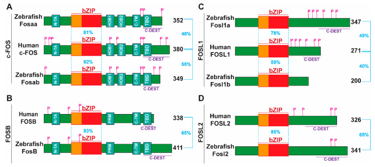Schematic representation of human and zebrafish FOS proteins. Depicted are human and zebrafish sequences related to c-FOS (A), FOSB (B), FOSL1 (C), and FOSL2 (D). Functional regions indicated are the basic leucine zipper (bZIP) including the basic region for DNA interaction (orange box) and leucine zipper for dimerization (red box), N-terminal transactivation domain (N-TA), homology box one and two (HOB1, HOB2), proline-rich motif (PRM), C-terminal transactivation motif (C-TM), transactivation domain (TBD), and destabiliser region (C-DEST). Previously characterised phosphorylation (P) sites curated in the Phosphosite database (phosphosite.org (accessed on 24 July 2022)) are indicated. The percentage identity within the bZIP domain and overall protein are indicated by blue dotted or solid lines and text, with the protein length indicated on the left in black text.