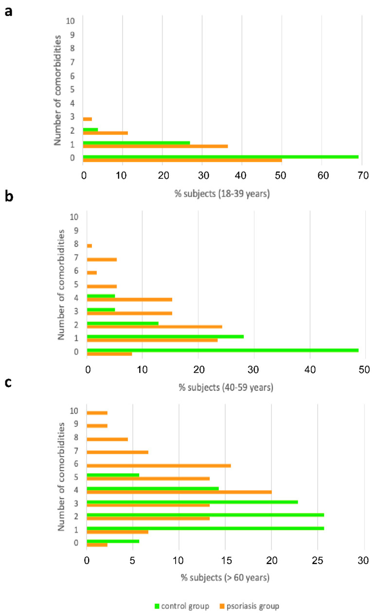 Number of comorbidities in psoriasis and control groups according to their chronological age. Number of comorbidities presented in psoriasis and control groups in the different age groups: 18–39 (a), 40–59 (b) and >60 (c) years old.