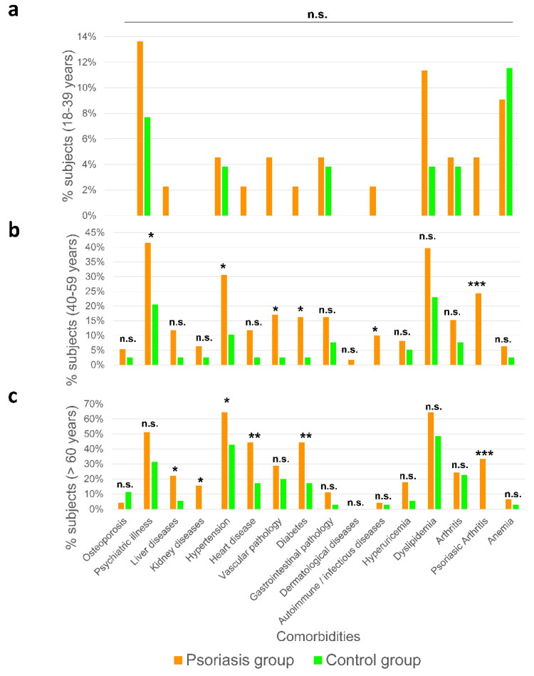 Number of comorbidities in psoriasis and control groups according to their chronological age. Incidence of the different comorbidities of psoriasis and control group subjects of 18–39 (a), 40–59 (b) and >60 (c) years old. p-Values were calculated using a Chi-squared test. * p < 0.05; ** p < 0.01; *** p < 0.001; n.s., non-significant.