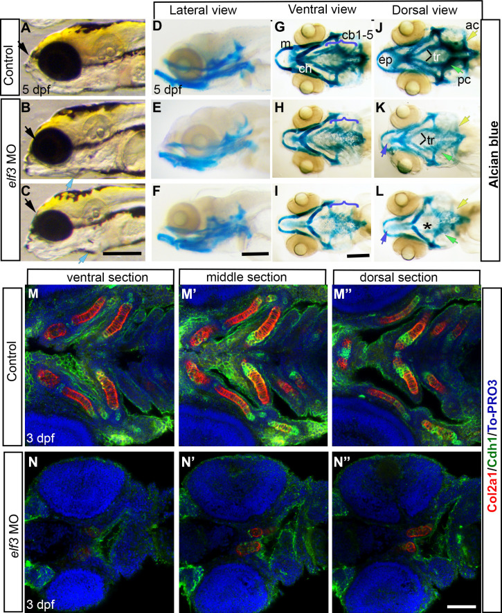 (A-C) Live images of 5 dpf Elf3 morphants show protruded jaw (blue arrow) and smaller head (black arrow) and eye (B, C) compared to control (A). (D-L) Alcian blue stained head skeleton of control and morphant larvae. Ventral view shows normal cartilages in control (G) and near-normal Meckel’s (m) and ceratohyal cartilages (ch) and poorly developed branchial cartilages (cb 1–5) in morphants (H, I). Dorsal view shows normal neurocranium in control (J) and smaller ethmoid plate (purple arrow), lack of trabecula (tr and *), parachordal cartilage (pc and green arrow) and auditory cartilage (ac and yellow arrow) in morphants (K, L). (M-N”) Col2α1 and E-cadherin (Cdh1) antibody stained 3 dpf larvae marked developing Meckel’s, Ceratohyal, 1st and 2nd branchial arches, and ethmoid plate in control larvae (M-M”) and a pair of cartilage (presumably Ceratohyal) in the morphant larvae (N-N”). Scale bar for A-C; D-F; and G-L = 200 μm. Scale bar for M-N” = 100 μm.