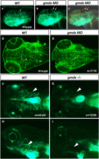 Fig. 4 Analysis of endothelial cell organization and smooth muscle cell number due to loss of gmds. In gmds morphant embryos, ectopic branches of cerebral vessels are observed at 3 dpf (B, C, E white arrows) when compared to control injected embryos (A, D). Panel C shows merged gfp and brightfield images to show the location of cerebral hemorrhage (hindbrain ventricle) near the site of an ectopic branch as highlighted by fli1a:gfp expression. gmds mutant embryos showed decreased smooth muscle actin cells in the bulbus arteriosus and pharyngeal arch arteries (G ventral view, I, lateral view) compared to wildype siblings (F, ventral view, H, lateral view) at 5 dpf. Embryos were deemed wildtype (+/+ or +/−) based on a lack of hemorrhage and curly tail, or mutant based on the presence cerebral hemorrhage and curly tail.