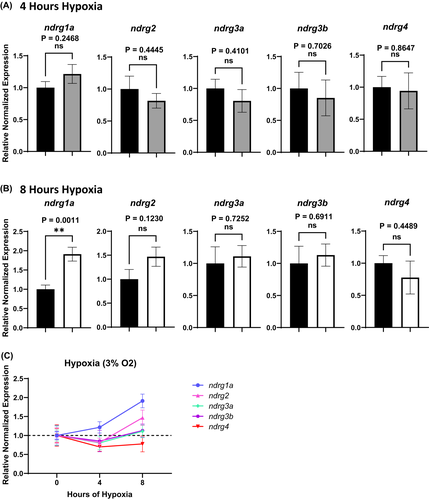 Fig. 4 Changes in ndrg transcript levels in response to hypoxia (3% oxygen). (A, B) Real-time qPCR analysis of 24 hpf zebrafish embryos exposed to 4 h (A, grey bars) or 8 h (B, white bars) of hypoxia relative to normoxic (stage-matched) controls (A, B, black bars) normalized to ef1a. (C) Plotted graphical summary of qPCR results. The y-axis in the graphs represents the relative normalized expression of each gene. All fold changes were derived using the formula, 2−(ΔΔCT), error bars represent standard error of the mean. Significance was obtained using the unpaired, two-tailed t-test with Welch’s Correction. **p < .01. Reactions were run in triplicate with 7–8 biological replicates (n = 7–8).