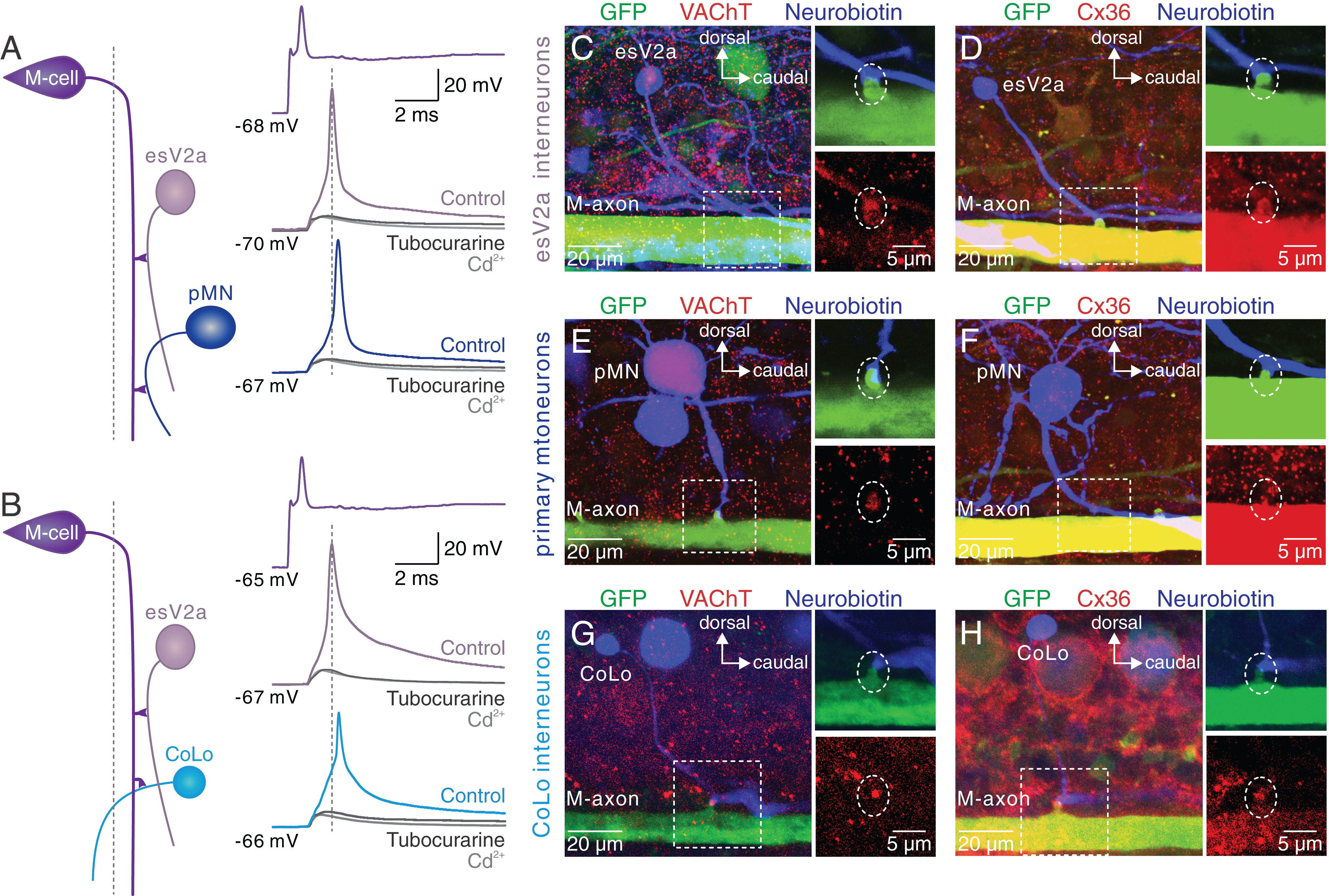 Fig. 2 esV2a interneurons are recruited prior to pMNs and CoLo interneurons. (A) Triple whole-cell patch-clamp recording from an M-cell, an esV2a interneuron and a pMN. M-cell activation recruited first the esV2a interneuron and then the pMN. d-tubocurarine suppressed the firing of both neurons and only a Cd2+-insensitive eEPSP remained. (B) Triple whole-cell patch-clamp recording from an M-cell, an esV2a interneuron and a CoLo interneuron. The latter was recruited later than the esV2a interneuron. The cholinergic cEPSPs in both neurons were blocked by d-tubocurarine, leaving only an eEPSP remained that was unaffected by Cd2+. (C) Direct contact between the M-axon (green) and the axon of an esV2a interneuron (blue). VAChT (red) was expressed at the site of presumed synaptic contact (dashed box, Left). The large soma corresponds to a pMN expressing GFP in this line. (D) Expression of Cx36 (red) at the site of synaptic connections between the M-axon and esV2a interneuron (blue). (E) The expression of VAChT (red) was found at the presumed synaptic contact site between an M-axon (green) and a pMN (blue). (F) Cx36 (red) is expressed at the connection site between the M-axon and pMN. (G) The expression of VAChT (red) was found at the presumed synaptic contact site between an M-axon (green) and a CoLo interneuron (blue). (H) Expression of Cx36 (red) at the connection site between the M-axon and CoLo interneuron. The Right Upper and Lower panels in C–H represent magnification of the regions indicated by the dashed boxes in the Left panels. The white dotted circle indicates the synapses formed by the M-cell and spinal neurons.