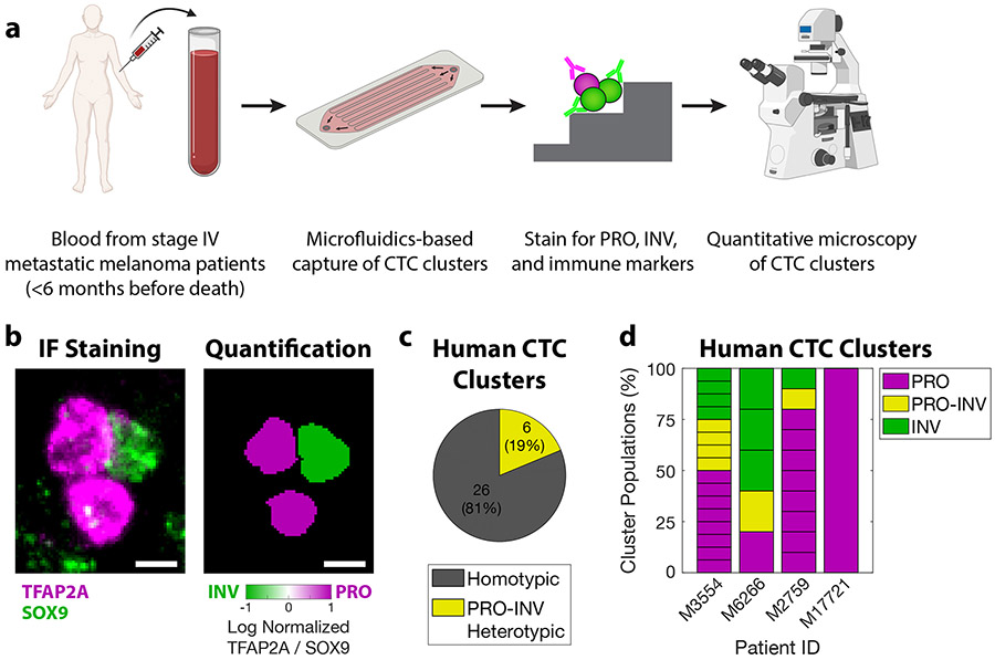Fig. 6 PRO-INV heterotypic CTC clusters exist in the blood of melanoma patients. a. Schematic of experimental design. b. (left) IF staining for TFAP2A and SOX9 (composite image) and (right) nuclear quantification in a PRO-INV heterotypic melanoma CTC cluster. Scale bar is 5μm. c-d. Classification of human melanoma CTC clusters based on quantification of nuclear TFAP2A and SOX9 staining as (c) homotypic (PRO-only or INV-only) vs. PRO-INV heterotypic, and (d) PRO, PRO-INV, and INV. For c-d n=32 clusters from 4 patients. 5 additional patients were analyzed with no CTC clusters identified. For d each stacked box represents one CTC cluster. See also Figure S6 and Table S7.