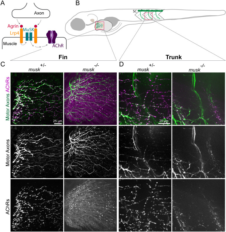 MuSK is required for pectoral fin neuromuscular synapse development. (A) Schematic of the Agrin/Lrp4/MuSK pathway. (B) Schematic of a larval zebrafish at 120 hpf. Red boxes outline regions of the fin and trunk that are shown in C,D. (C) Abductor muscle innervation in the pectoral fin in 120 hpf larvae expressing Tg(mnx1:GFP) to label motoneurons and stained with α-Btx to label AChRs. musk heterozygous sibling pectoral fins exhibit an innervation pattern with numerous small AChR clusters (n=45/45), whereas musk mutants have an exuberant innervation pattern with diffuse AChR signal throughout muscle fibers in the fin and some focal AChR clusters (n=25/25). (D) Trunk innervation from the same animals shown in C. musk mutants form fewer and smaller neuromuscular synapses compared with sibling controls. SC, spinal cord.