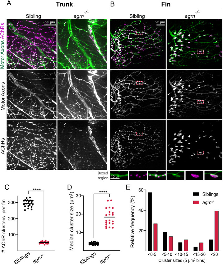 Agrin is required for correct axon innervation and AChR patterning in the pectoral fin. (A) Trunk innervation in 120 hpf larvae expressing Tg(mnx1:GFP) to label motor axons and stained with α-Btx to label AChRs. Trunks in agrn mutants form fewer and smaller neuromuscular synapses. (B) Abductor muscle innervation in the pectoral fin from the same animals shown in A. Agrn siblings exhibit an innervation pattern with numerous small AChR clusters, whereas agrn mutants have swellings in the innervation pattern directly opposed to enlarged AChR clusters throughout muscle fibers in the fin. Insets from boxed regions show an even distribution of small AChR clusters (magenta) in siblings, whereas mutants have large AChR clusters that colocalize with green axon swellings. All images are maximum intensity projections that include the same number of slices for each genotype. (C,D) Quantification of the number of AChR clusters per fin (C) and the median cluster size per fin (D). (E) Histogram of the distribution of AChR cluster sizes across all fins quantified (5 μm2 bins). ****P<0.0001, unpaired t-test. n=23 (siblings), 21 (mutants).