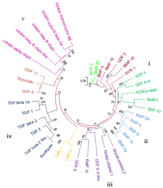 Phylogenetic relationship of 38 BMP members identified in zebrafish genome. Phylogenetic tree was produced using a maximum likelihood (ML) method with 1000 bootstrap replicates in MEGA-X software. I–V represent five major clades.