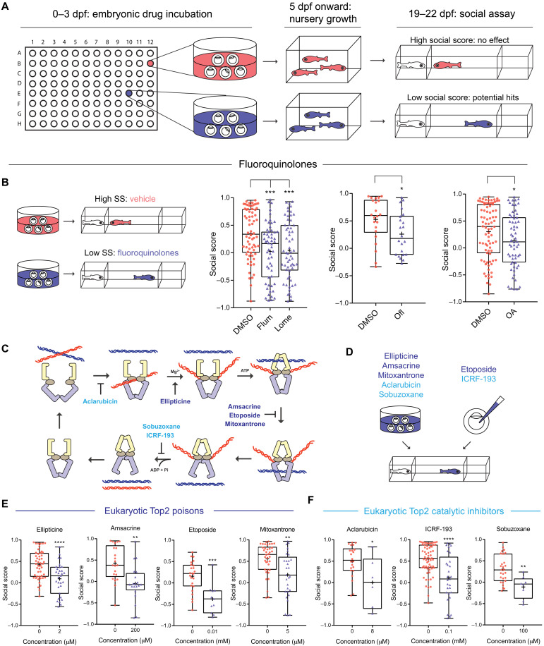 (A) Screening workflow. (B) Fluoroquinolones induce social deficits. Comparing DMSO (n = 68, 22, and 82, from left to right) with flumequine (Flum; 25 μM; n = 56), lomefloxacin (Lome; 100 μM; n = 60), ofloxacin (Ofl; 200 μM; n = 22), and oxolinic acid (OA; 200 μM; n = 62). SS, sodium salicylate. (C) The catalytic cycle of Top2 and inhibitors targeting different steps of the cycle. ATP, adenosine 5′-triphosphate; ADP, adenosine 5′-diphosphate. (D to F) Eukaryotic Top2 inhibitors induce social deficits (D). Comparing fish treated with vehicle control (0 μM in each panel); Top2 poisons ellipticine (0 μM: n = 48; 2 μM: n = 31), amsacrine (0 μM: n = 21; 200 μM: n = 20), etoposide (0 μM: n = 24; 10 μM: n = 11), and mitoxantrone (0 μM: n = 38; 5 μM: n = 29) (E); and Top2 catalytic inhibitors aclarubicin (0 μM: n = 22; 8 μM: n = 6), ICRF-193 (0 μM: n = 65; 100 μM: n = 29), and sobuzoxane (0 μM: n = 27; 100 μM: n = 8) (F). *P < 0.05, **P < 0.01, ***P < 0.001, and ****P < 0.0001.