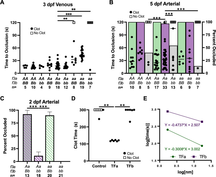 (A) Laser-mediated venous endothelial injury at 3 dpf shows that the time to occlusion (TTO) was not altered by loss of TFb (AA/bb, Aa/bb) but was delayed in the complete absence of TFa (aa/BB, aa/Bb). Thrombus formation was absent after complete TF loss (aa/bb). (B) Laser-mediated arterial endothelial injury at 5 dpf shows that the ability to form occlusive thrombi was significantly reduced in fish lacking TFb (AA/bb, Aa/bb, aa/bb, indicated by grey bars) compared to BB and Bb groups (green and purple bars; respectively). (C) Endothelial injury at 2 dpf confirms the dependence on TFb in the arterial system prior to the presence of thrombocytes. Occlusive thrombi were nearly absent without TFb (Aa/bb, aa/bb). (D) Relipidated recombinant TFa or TFb proteins (173 nM) were mixed with citrated trout plasma, and recalcified. TFa-liposomes induced clot formation during a manual tilt test significantly faster than TFb-liposomes or empty liposome controls. The reaction was observed until 300 seconds, and then again at 15 minutes to assess for delayed clot formation (the latter observation is indicated by an open or closed circle at 300 seconds). (E) The assay was repeated with relipidated TF diluted in 0.5x HBS (20 mM HEPES pH 7.5, 50 mM NaCl) and plotted on log-log axes demonstrating 10 to 100-fold higher procoagulant activity of TFa over TFb. Statistical significance by Mann-Whitney U testing: ** < 0.01, *** < 0.001. All phenotypic data were collected by an observer blinded to genotype. Open squares in A and B indicate individual larvae that did not occlude within 120 seconds.