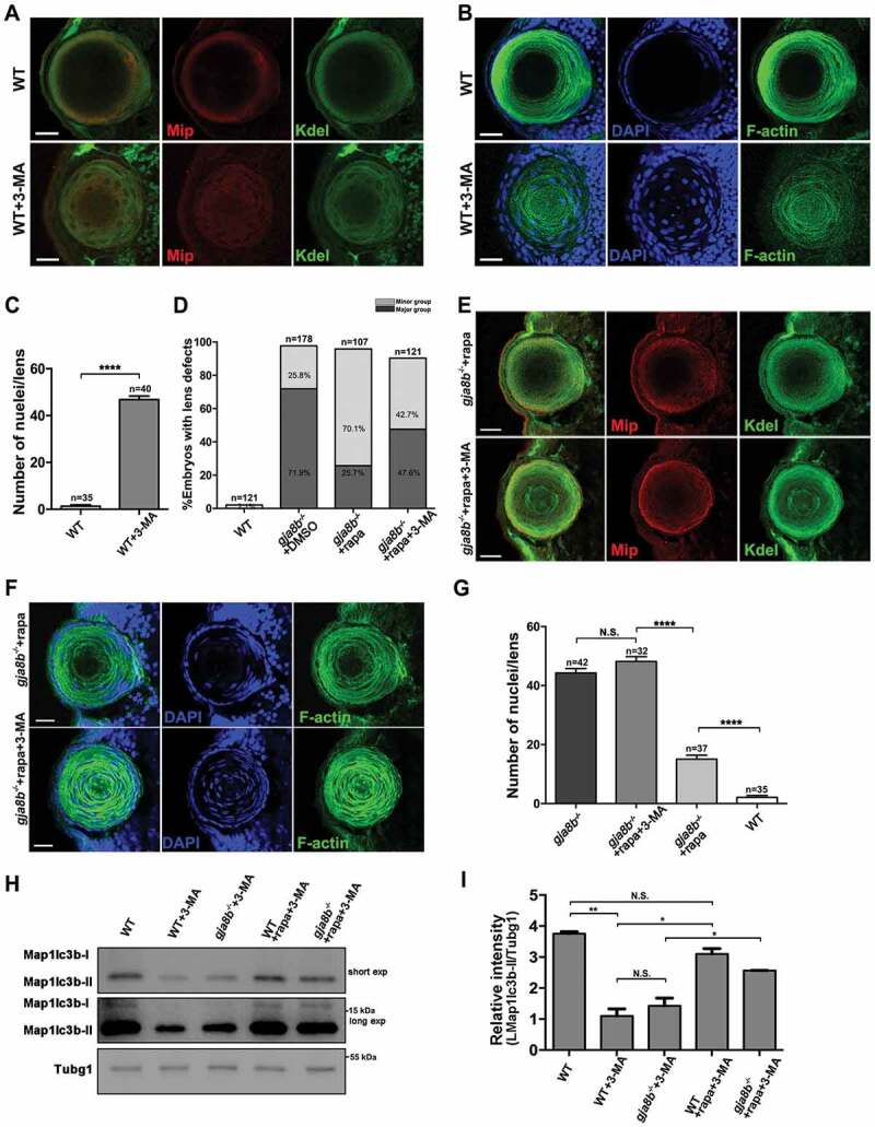 3-MA treatment blocks the rescue effects of rapamycin in gja8b mutant zebrafish lenses. (A) Shows representative images of the distribution of Kdel and Mip, and (B) shows representative images of nuclei and F-actin in the lens of WT and WT zebrafish treated with 4 mM 3-MA at 72 hpf. (C) Average number of lens fiber cell nuclei per lens (n > 30 zebrafish for each group). (D) Statistical analysis of the severity of lens defects in 72 hpf WT, gja8b mutants, gja8b mutants treated with rapamycin, and gja8b mutants treated with 25 μM rapamycin and 4 mM 3-MA (n > 120 zebrafish for each group). (E) Shows representative images of the distribution of Kdel and Mip, and (F) shows representative images of nuclei and F-actin in the lens of gja8b mutants treated with 25 μM rapamycin and gja8b mutants treated with 25 μM rapamycin plus 4 mM 3-MA at 72 hpf. (G) Average number of lens fiber cell nuclei per lens (n > 30 zebrafish for each group). (H) Shows the concentration of endogenous Map1lc3b-I and Map1lc3b-II in WT, WT treated with 4 mM 3-MA, gja8b mutants treated with 4 mM 3-MA, WT treated with 25 μM rapamycin and 4 mM 3-MA, and gja8b mutants treated with 25 μM rapamycin and 4 mM 3-MA. Short exp and long exp: short exposure and long exposure. (I) Shows the quantitative analysis of relative intensity of Map1lc3b-II normalized to the Tubg1 control (n = 3 independent experiments). Scale bars: 50 μm. Mean ± SEM, *p < 0.05, **p < 0.01, ****p < 0.0001