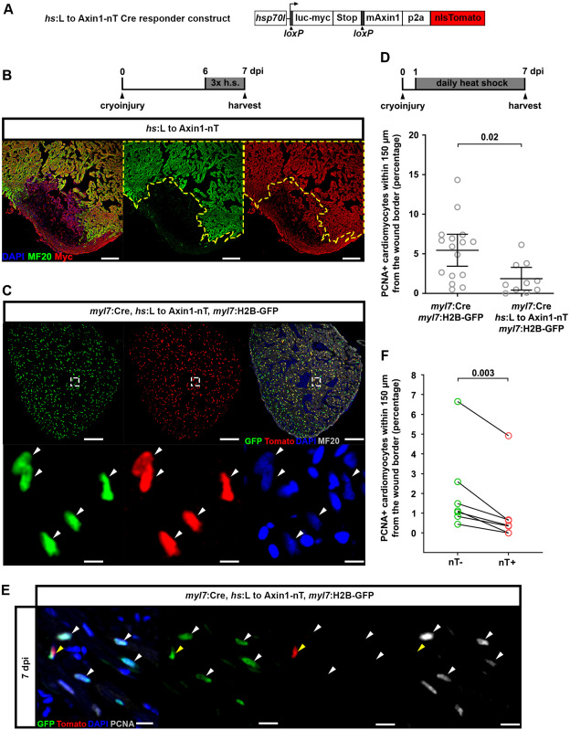 Fig. 5. Wnt/β-catenin signaling acts cell-autonomously in cardiomyocytes to promote cell cycle re-entry. (A) Illustration of the Cre responder construct hsp70l:LOXP-luc-myc-STOP-LOXP-mAxin1-p2a-nlsTomato, cryaa:AmCyan (abbreviated hs:L to Axin1-nT). (B) MF20 and Myc immunostaining to detect expression of myc-tagged luciferase in cryoinjured hs:L to Axin1-nT hearts, heat-shocked (h.s.) 3 times every 8 h from 6 dpi and harvested at 7 dpi 8 h after the last heat-shock. The yellow dotted lines represent the outline of the MF20+ cardiomyocyte area. n (hearts) = 5. Scale bars, 100 μm. (C) Tomato, GFP and MF20 immunostaining of hearts from heat-shocked myl7:Cre, hs:L to Axin1-nT, myl7:H2B-GFP fish. White arrowheads point to DAPI+nT+GFP+ cardiomyocyte nuclei. Scale bars, 100 μm (overview), 10 μm (magnification). (D) Quantification of PCNA+GFP+/GFP+ borderzone cardiomyocytes of cryoinjured hearts from myl7:Cre, hs:L to Axin1-nT, myl7:H2B-GFP fish and myl7:Cre, myl7:H2B-GFP siblings, heat-shocked daily from 1 to 7 dpi. n (hearts) = 16 (myl7:Cre, myl7:H2B-GFP), 10 (myl7:Cre, hs:L to Axin1-nT, myl7:H2B-GFP). Error bars represent CI 95%. Unpaired Welch's unequal variances t-test. (E) Tomato, GFP and PCNA immunostaining of 7 dpi hearts from myl7:Cre, hs:L to Axin1-nT, myl7:H2B-GFP fish, heat-shocked daily from 1 to 7 dpi. White arrowheads point to PCNA+nT—GFP+ cardiomyocytes, yellow arrowheads point to PCNA—nT+GFP+ cardiomyocytes. Scale bars, 100 μm (overview), 10 μm (magnification). (F) Quantification of PCNA+nT—GFP+/nT—GFP+ and PCNA+nT+GFP+/nT+GFP+ borderzone cardiomyocytes of cryoinjured hearts from myl7:Cre, hs:L to Axin1-nT, myl7:H2B-GFP fish, heat-shocked daily from 1 to 7 dpi. n (hearts) = 7. Paired t-test.