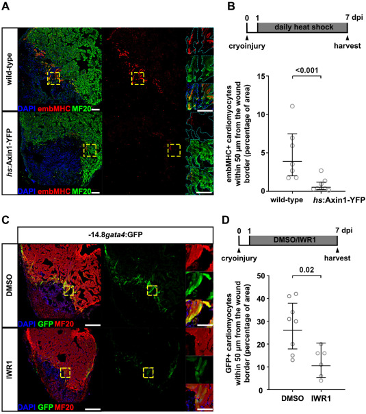 Fig. 6. Inhibition of Wnt/β-catenin signaling prevents cardiomyocyte dedifferentation. (A) embMHC and MF20 immunostaining on cryoinjured hearts of hs:Axin1-YFP fish and wild-type siblings, heat-shocked daily from 1 to 7 dpi. n (hearts) = 7 (wild-type), 8 (hs:Axin1-YFP). In the magnified view, the cyan dotted lines represent the outline of the MF20+ cardiomyocyte area. Scale bars, 100 μm (overview), 10 μm (magnification). (B) Quantification of the embMHC+MF20+/MF20+ area in the 50 μm wound borderzone of images shown in (A). Error bars represent CI 95%. Unpaired Welch's unequal variances t-test. (C) MF20 and GFP immunostaining on cryoinjured hearts of −14.8gata4:GFP fish treated with DMSO or IWR1 from 1 to 7 dpi. n = 8 (DMSO), 6 (IWR1). Scale bars, 100 μm (overview), 10 μm (magnification). (D) Quantification of GFP+MF20+/MF20+ area in the 50 μm wound borderzone of images shown in (C). Error bars represent CI 95%. Unpaired Welch's unequal variances t-test.