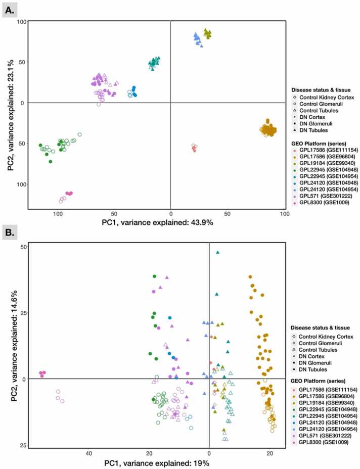 PCA of control and DN human kidney tissue datasets. Shown are the first two most variance-explaining principal components (PC) of RMA/log2-normalized and gene-level-averaged gene expression across all datasets (A) before or (B) after adjusting for batch-effects.