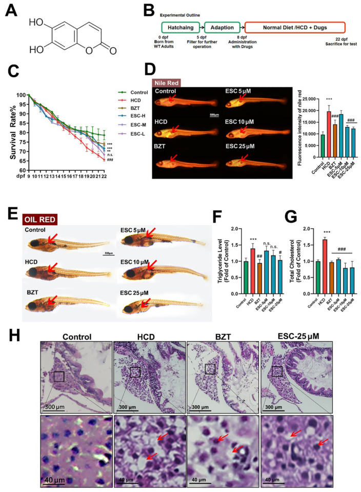 Lipid lowering effect of ESC on an HCD-induced larval zebrafish model. (A) The chemical structure of ESC. (B) Experimental outline of the larval zebrafish experiments. (C) Survival rate of Tablelarval zebrafish. (D) Nile red stain of larval zebrafish. (E) Oli red stain of larval zebrafish. (F) Triglyceride of larval zebrafish. (G) Total cholesterol of larval zebrafish. (H) HE stain of larval zebrafish liver, and the hepatic steatosis is pointed by red arrows. Bar indicates means ± SD. ** p < 0.01, *** p < 0.001 represent compared with the control; n.s. represents no significance; # p < 0.05, ## p < 0.01, ### p < 0.001 represents compared with the model. p < 0.05 was considered as statistically significant calculated by One-way ANOVA followed by Tukey’s test (n = 3, n indicates the replicates of the experiment).