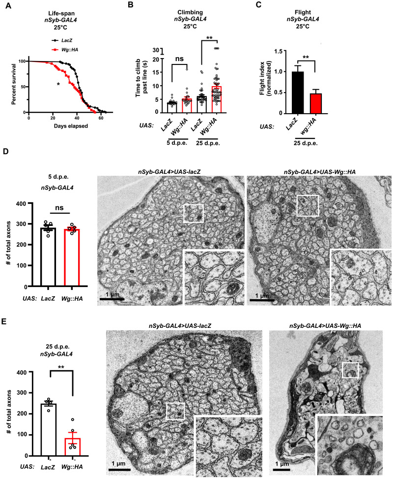 (A) Survival curves for neuronal expression of UAS-LacZ or UAS-Wg::HA using nSyb-GAL4 at 25°C. A minimum of 43 flies per genotype (*P < 0.05). Statistical analyses were determined by the log-rank test. (B) nSyb-GAL4, UAS-Wg::HA flies exhibit progressive climbing defects. Time (seconds) required for flies of the indicated genotypes to climb past 7 cm (n > 20 per genotype). Statistical analyses are one-way ANOVA followed by a Tukey post hoc test. Results are means ± SEM (**P < 0.01). (C) nSyb-GAL4, UAS-Wg::HA flies exhibit flight defects at 25 d.p.e. compared to nSyb-GAL4, UAS-LacZ controls when dropped into the center of a 2-liter graduated cylinder (n > 32 per genotype). Results are means ± SEM (**P < 0.01). Statistical analyses were determined by two-tailed Student’s t test. (D and E) Transmission electron microscopy of the peripheral wing nerves containing peripheral neurons of the anterior wing margin. Quantification shows the total axon number at (E) 5 d.p.e. upon neuronal (nSyb-GAL4) overexpression of UAS-LacZ or UAS-Wg::HA (n = 5 each genotype) and the same genotypes at 25 d.p.e. (UAS-LacZ, n = 4; UAS-Wg::HA, n = 5). Results are means ± SEM (**P < 0.01). Statistical analyses were determined by two-tailed Student’s t test. Scale bars, 1 μm.
