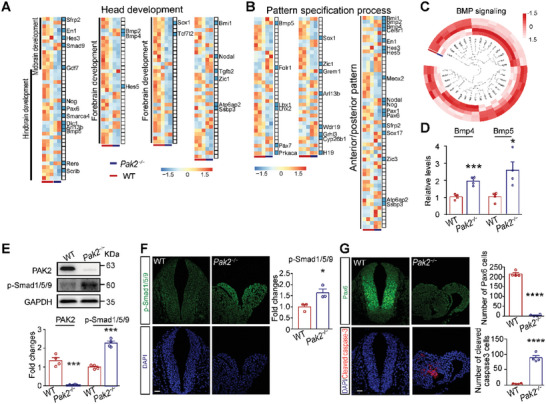 Pak2 −/− mouse embryos exhibit upregulated BMP signaling. A,B) GO analysis indicates that DEGs are enriched in head development and pattern specification processes. Blue bars indicate NTD‐related genes. Scale bar: transcripts per million (TPM) after log2 transforms and Z‐score normalization. C) DEGs that are closely related to BMP signaling in Pak2 −/− embryos. D) The levels of key components of BMP signaling, including Bmp4 and Bmp5, in WT and Pak2 −/− embryos at E9.5. Bmp4: t (6) = 6.112, p = 0.0009; Bmp5: t (6) = 3.06, p = 0.0222. n = 4 embryos for each genotype. E) The level of PAK2 and p‐Smad1/5/9 (Ser465) in Pak2 −/− embryos as shown via western blotting (for PAK2, WT, 1.347 ± 0.151; Pak2 −/− mice, 0.059 ± 0.009; t (6) = 8.542, p = 0.0001; for p‐Smad1/5/9, WT, 1 ± 0.057; Pak2 −/− mice, 2.272 ± 0.109; t (6) = 10.35, p < 0.0001) of the hindbrain of embryos at E9.5. n = 4 embryos for each genotype. F) The level of p‐Smad1/5/9 (Ser465) in Pak2 −/− mice as shown via immunofluorescence analysis of the hindbrain of embryos at E9.5. WT, 1 ± 0.106; Pak2 −/− mice, 1.632 ± 0.170; t (4) = 3.161, p = 0.034. n = 3 embryos for each genotype. G) The numbers of Pax6‐positive cell (WT, 214.3 ± 6.921; Pak2 −/− mice, 4.5 ± 2.021; t (6) = 29.09, p < 0.0001) and cells stained with cleaved caspase‐3 (WT, 3.250 ± 0.750; Pak2 −/− mice, 88.25 ± 7.028; t (6) = 12.03, p < 0.0001) in the hindbrain of WT and Pak2 −/− embryos at E9.5. n = 4 embryos for each genotype. Unpaired t test. Scale bar: 20 µm.