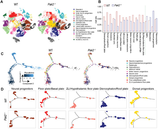 Abnormal developmental process in Pak2−/− embryos. A) The annotation and color codes for cell clusters in WT and Pak2−/− embryos at E9.5 as revealed by scRNA‐seq analysis. B) Cell ratio in different cell cluster between WT and Pak2 −/− embryos. C) Pseudotime‐ordered analysis of 11 cell types related to neural tube in WT and Pak2−/− embryos. The blue trajectory includes cell types in both WT and Pak2−/− samples. D) Representative developmental trajectory of cell types from WT and Pak2−/− samples via pseudotime‐ordered analysis.