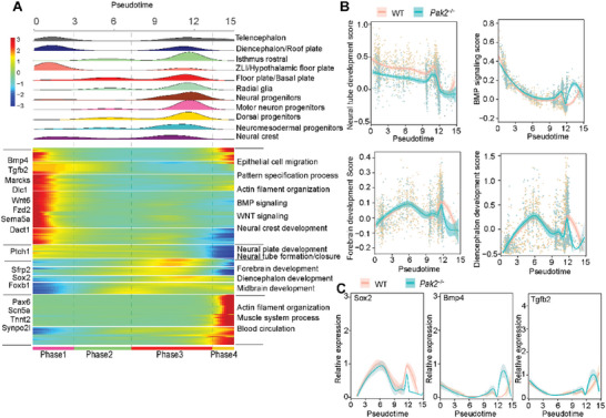 Abnormal transcriptional changes along with abnormal developmental process in Pak2 −/− embryos. A) Heatmap showed the dynamic changes in gene expression along the pseudotime (lower panel). Cell types are labeled by colors (upper panel). B) 2D plots show the expression scores related to neural tube development, BMP signaling, forebrain development, and diencephalon development along the pseudotime. C) 2D plots show the dynamic expression of representative genes during neural tube development along the pseudotime.